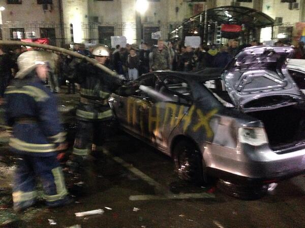 Посольство РФ всё в краске, яйцах, зеленке, машины перевернуты.