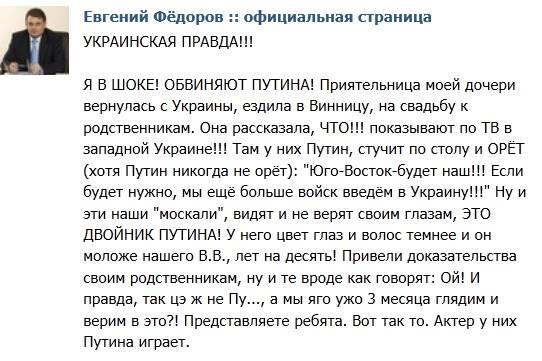 Тот, кому любая информация кажется достоверной если её можно использовать против Украины. И тот, который даже по своих ссылках не видит другой информации. Вот что делает сформированная картина окружающего мира с помощью Life News и других правдивых СМИ. И я не знаю как такое можно исправить. Раньше думал что именно с помощью интернета и возможности сравнения разных источников информации люди станут более независимыми от пропаганды. Но нет – достаточно изначальной установки – из школы, компании друзей или зомбоящика, и человек перестаёт мыслить. Просто ищет подтверждение того, что ему вбили в голову.