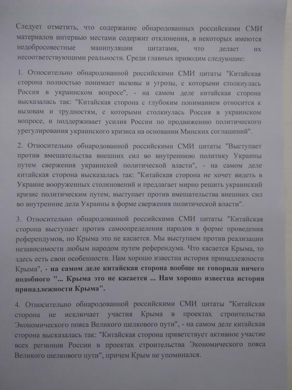 Власти Китая не заявляли о том, что поддерживают аннексию украинского Крыма Россией. Перевод выдержки из ноты китайского внешнеполитического ведомства на запрос Украины опубликовал спикер МИД Украины Евгений Перебыйнис. «Перевод выдержек из ноты МИД КНР, подтверждающих вранье росСМИ. Привет ИТАР-ТАСС. Будет опровержение или как всегда?» — написал Перебийнис. В опубликованном скриншоте указано, что цитата об особенностях национального самоопределения Крыма является полностью выдуманной и никогда не звучала. В другом случае российское агентство процитировало китайский МИД верно, но самовольно отнесло трактовку и к Крыму, хотя в оригинальном заявлении украинский полуостров не упоминался