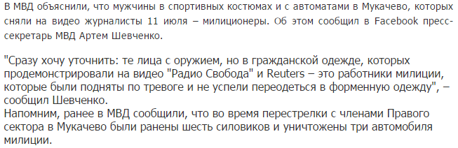 «Сейчас будет активизация боевых действий на востоке. Пока мы тут, в Мукачево. Здесь столько милиции и такое количество спецслужб, что удивляемся. Раз говорят, что у нас антитеррористическая операция, которую должны проводить СБУ и МВД, что делаю здесь эти тысячи представителей милиции и СБУ? С такими силами мы можем зачистить Широкино за 5 минут, а Донецк освободить за 2 часа. Мы смотрим, и поражаемся – стянули тысячи людей, а там некому на блокпостах стоять. Аваков и Порошенко, я спрашиваю у вас: что это? На востоке недоукомплектованные батальоны, а тут на вертолетах летают. А где это вооружение на востоке? Почему там вертолетов нет?»