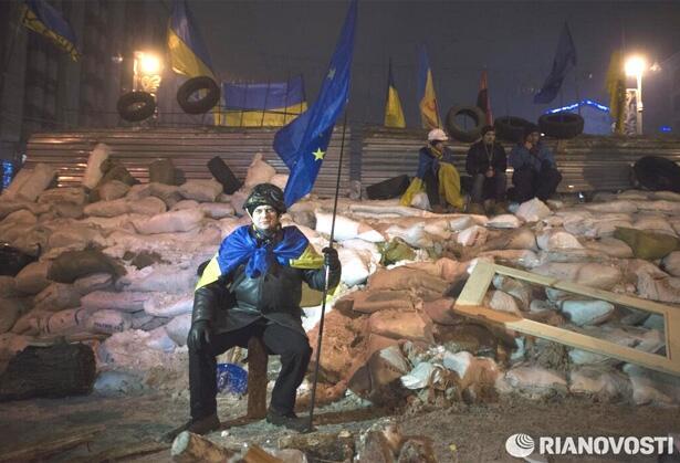 Военный комиссар ЕС командует бойцами #Евромайдан'а. Для баррикад используются даже рамки от краденных картин.
