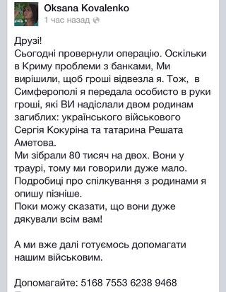 Крым_СОС bkb? yfghbvth Jксане Коваленко(журналистка УП, организовывает сбор средств -- в твиттере superumka