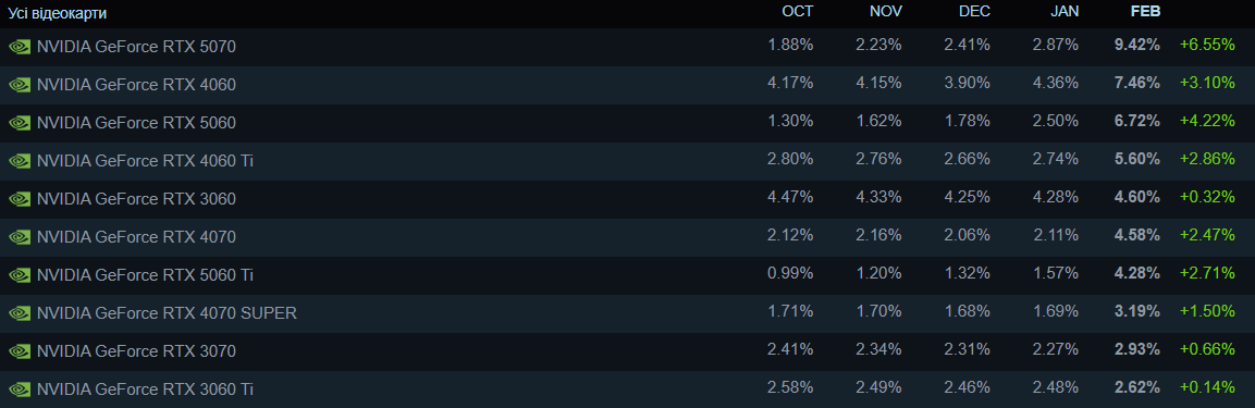 Статистика Steam: GeForce RTX 5070 раптово стала найпопулярнішою відеокартою