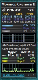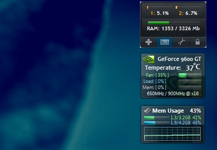 С Quad Core Использование гаджета оперативной памяти был упущен многими, я еще построил небольшое устройство, что выполнить это пожелание. Зеленая полоса обозначает физической памяти и синяя полоса указывает на использование файла подкачки.